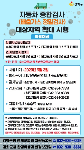 자동차 종합검사 대상은 강화군에 등록된 자동차 중 검사유효기간 만료일이 오는 9월 3일 이후인 자동차이며 유효기간 만료일 전후 31일 이내에 받아야 한다. 소형차 기준으로 평균 3만 원의 자동차 검사 수수료가 추가로 발생한다. 다만, 전기차·수소전기차 등 저공해자동차는 종합검사 대상에서 제외된다.