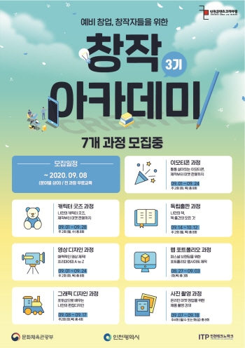 이번 창작아카데미는 이모티콘, 캐릭터 굿즈, 독립출판, 영상 디자인, 웹 포트폴리오, 그래픽디자인, 사진 촬영 등 모두 7개 과정으로, 모집정원은 각각 15명씩이다.