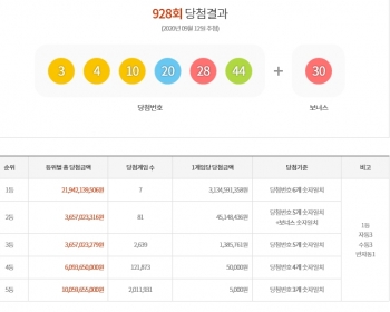 [뉴스카페]12일 추첨한 동행복권 928회 로또6/45 1등 당첨자는 7명으로 1인당 31억3,459만원씩의 당첨금을 받는다.