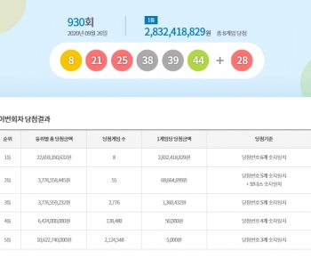 [뉴스카페]26일 추첨한 동행복권 930회 로또6/45 1등 당첨자는 8명으로 1인당 28억3241만원씩의 당첨금을 받는다.