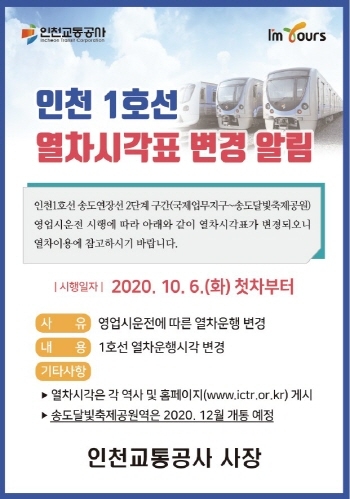 [뉴스카페]인천교통공사(사장 정희윤)는 인천도시철도 1호선 송도연장 2단계 구간(국제업무지구~송도달빛축제공원) 영업시운전 시행에 따라 2020년 10월 6일 첫차부터 인천도시철도 1호선 열차운행시각이 변경된다고 밝혔다.