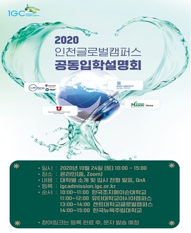 [뉴스카페]인천글로벌캠퍼스운영재단(대표 백기훈)은 10월 24일 토요일 인천글로벌캠퍼스(IGC, Incheon Global Campus) 입주 대학들과 함께 온라인 입학설명회를 개최한다.