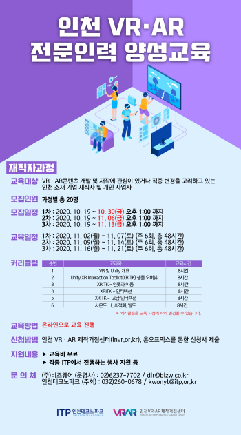 지원대상은 인천지역 기업 재직자 및 개인사업자로, 수강생에게는 VR·AR제작거점센터 행사 참여 및 장비대여 등의 혜택이 주어진다.