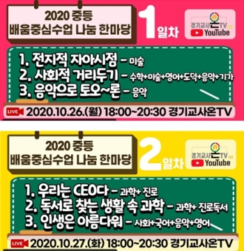 [뉴스카페]경기도교육청(교육감 이재정)이 26일부터 29일까지 ‘2020 중등 배움중심수업 나눔 한마당’을 4차례에 걸쳐 실시간 온라인 방송을 한다.