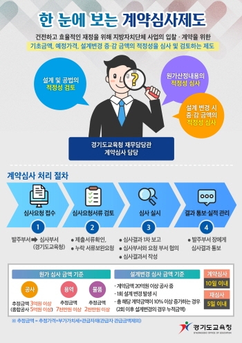 계약심사는 입찰·계약을 하기 위한 기초금액, 예정가격의 적정성과 적법성을 심사하고 검토하는 제도로, 도교육청은 재정 건전과 효율을 높이기 위해 2012년 17개 시·도교육청 가운데 최초로 도입했다.
