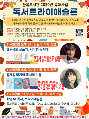 11월 매주 일요일 오후 3시에 운영되는 독서트라이애슬론의 강연 및 모임은 온․오프라인 동시에 이루어지며 오프라인 참여는 율목도서관 안내데스크 전화로만 받고 있다.