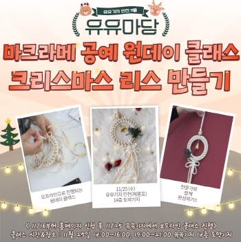 [뉴스카페]인천테크노파크(인천TP)가 운영하는 인천청년공간 ‘유유기지 인천(제물포)’은 오는 20일까지 ‘마크라메 공예, 크리스마스 리스(wreath) 만들기’ 수강생을 선착순으로 모집한다고 16일 밝혔다.