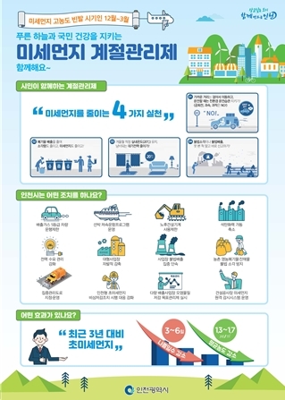 시는 지난‘미세먼지 계절관리제’시행을 통해 12월부터 올 3월까지 4개월간 인천의 초미세먼지(PM2.5) 평균 농도는 24㎍/㎥로 전년 같은 기간 32㎍/㎥보다 25% 감소하는 효과를 거둔바 있다.
