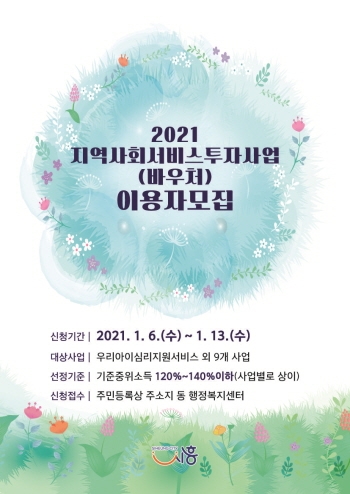 2021년 지역사회서비스투자사업 이용자 모집은 주민등록상 거주지 동 행정복지센터를 통해 접수하며, 참여를 원하는 주민은 신분증과 건강보험증사본, 사업별 필요서류 등을 준비해 방문·접수하면 된다.