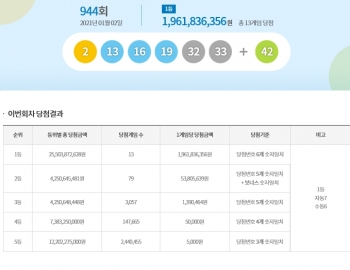 [뉴스카페]2일 추첨한 동행복권 944회 로또6/45 1등 당첨자는 13명으로 1인당 19억6,183만원씩의 당첨금을 받는다.