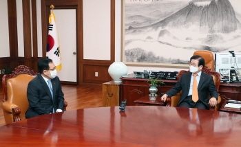 [뉴스카페]박병석 국회의장은 6일 오후 의장집무실에서 유영민 신임 대통령 비서실장의 예방을 받고 “과거 정부에 비해 소통이 늘었지만, 유 비서실장 취임을 계기로 청와대와 의회, 국민의 소통이 더 늘길 바란다”고 말했다.