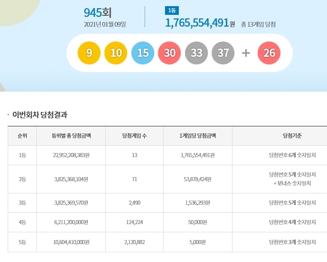 1등 당첨자는 당첨번호 6개의 숫자가 일치한 13명으로 각각 1,765,554,491원의 당첨금을 2등은 5개 번호 와 보너스 번호가 일치한 71명으로 각각 53,878,424원의 당첨금을 받는다.