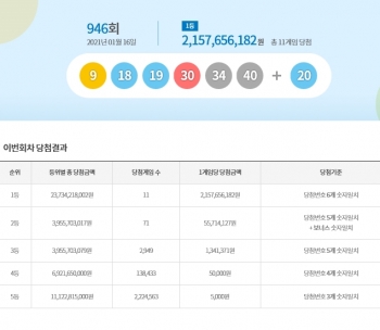 [뉴스카페]16일 추첨한 동행복권 946회 로또6/45 1등 당첨자는 11명으로 1인당 21억5,765만원씩의 당첨금을 받는다.