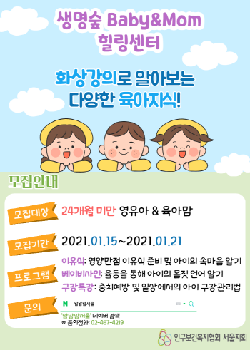 [뉴스카페]인구보건복지협회 서울지회(회장 황연옥)는 18일부터 ‘생명숲 Baby&Mom 힐링센터’ 수강생을 모집한다.