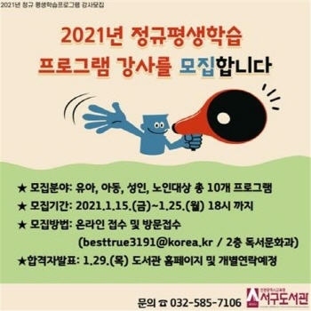 [뉴스카페]인천시교육청 서구도서관(관장 박진경)은 지역주민을 대상으로 2021년 평생학습프로그램을 운영할 참신하고 유능한 강사를 1월 25일까지 모집한다고 밝혔다.