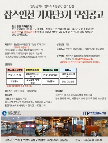 [뉴스카페]인천테크노파크(인천TP)가 운영하는 일자리 정보 소통 공간 ‘잡스인천’은 오는 15일까지 ‘잡스인천 기자단(3기)’을 모집한다고 31일 밝혔다.