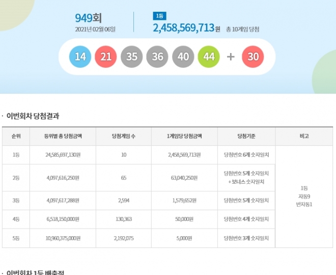 [뉴스카페]6일 추첨한 동행복권 949회 로또6/45 1등 당첨자는 10명으로 1인당 24억5,856만원씩의 당첨금을 받는다.