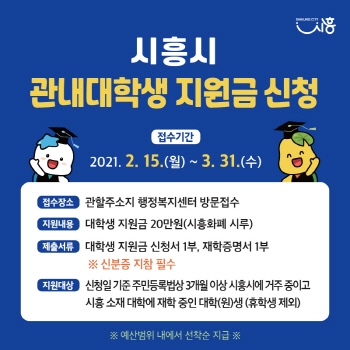 대학생 지원금 사업은 관내 대학(원)생들에게 20만원 이내에서 시흥화폐 시루를 지원한다. 지난해 12월 제정한‘시흥시 우수인재 유입 및 정착을 위한 관내대학생 지원 조례’에 의해 올해 처음 시행된다.