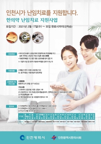 신청 희망자는 난임진단서, 자궁난관조영술결과지(최근 3년), 정액검사결과지(최근 3년)를 지참해 보건소 모자보건실, 영종 국제도시보건과에 방문해 신청하면 된다. 최종치료 지원 대상자는 인천광역시 선정위원회 심사 후 선정된다.