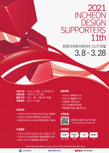 [뉴스카페]인천테크노파크(인천TP)는 오는 28일까지 인천디자인지원센터의 홍보 도우미 역할을 할 ‘인천디자인서포터즈 11기’를 모집한다고 8일 밝혔다.
