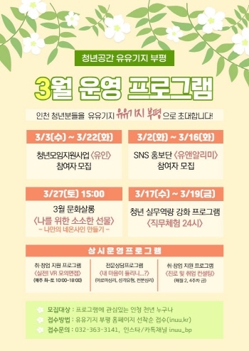 각 프로그램은 ‘유유기지 부평 홈페이지(inuu.kr)’에서 선착순으로 접수 가능하며, 인천 청년이면 누구나 무료로 신청할 수 있다. 접수 일정 등 자세한 내용은 유유기지 부평 홈페이지를 참고하거나 전화(☎363-3141)로 문의하면 된다.