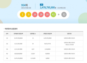 1등 당첨번호는 1, 9, 26, 28, 30, 41번이며, 2등 보너스 번호는 32번이다