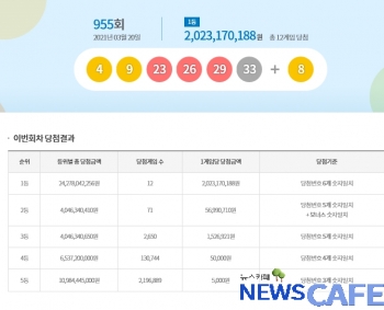 [뉴스카페]20일 추첨한 동행복권 955회 로또6/45 1등 당첨자는 12명으로 1인당 20억2,317만원씩의 당첨금을 받는다.