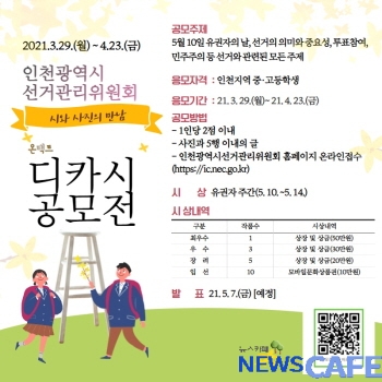 접수기간은 이달 29일 부터 다음달 23일까지이며, 제출방법은 온라인접수(인천광역시선거관리위원회위원회 홈페이지-공지사항-공모전 접수)로만 가능하며, '코로나 19'예방을 위해 방문 접수는 불가하다.