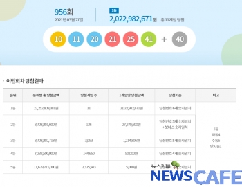 [뉴스카페]27일 추첨한 동행복권 956회 로또6/45 1등 당첨자는 11명으로 1인당 20억2,298만원씩의 당첨금을 받는다.