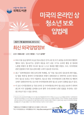 [뉴스카페]]국회도서관(관장 현진권)은 13일 '미국의 온라인 상 청소년 보호 입법례'를 소개한 최신외국입법정보'(2021-7호, 통권 제156호)를 발간했다.