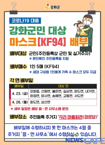 [뉴스카페] 강화군(군수 유천호)은 사회적 거리두기 2단계가 유지되는 가운데 전 군민에게 KF94 마스크 1인당 5매씩 배부했다고 23일 밝혔다.