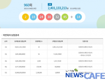 [뉴스카페]24일 추첨한 동행복권 960회 로또6/45 1등 당첨자는 10명으로 1인당 24억113만원씩의 당첨금을 받는다.