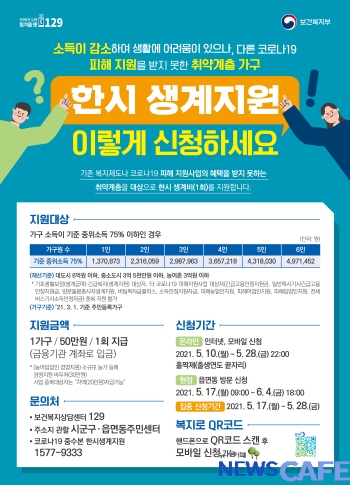 [뉴스카페]인천 연수구(구청장 고남석)는 내달 10일(온라인 5월 10일, 현장 5월 17일)부터 코로나19로 생계에 어려움을 겪는 주민들을 대상으로 한시 생계지원비 신청을 받는다.
