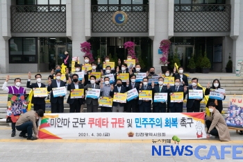 [뉴스카페] 인천광역시의회는 30일 시청 현관 앞에서 신은호 의장을 비롯해 손민호(행정안전위원회 위원장) 의원 등 30여 명과 녜잉뺴잉송(여·NYEIN PYAE SONE) 씨 등 주한 미얀마 봄 혁명 지지자 단체 관계자 5명 등이 참석한 가운데 ‘미얀마 군부 쿠데타 규탄 및 민주주의 회복 촉구’ 기자회견을 가졌다.