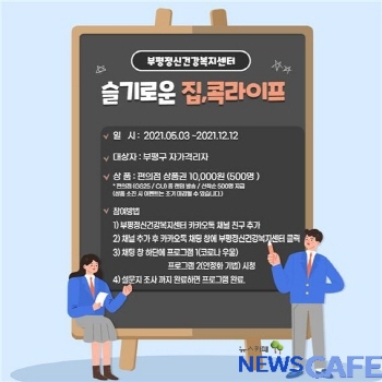[뉴스카페]인천 부평구(구청장 차준택)보건소는 6일 지역에 거주하는 코로나19 자가격리자를 대상으로 온라인 심리지원 프로그램 ‘슬기로운 집,콕 라이프’를 실시한다.