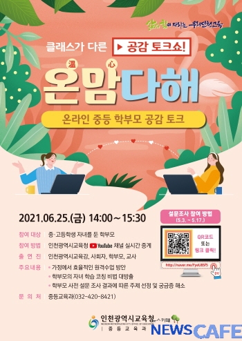 [뉴스카페]인천광역시교육청(교육감 도성훈)은 중·고등학교 학부모를 대상으로 ‘온맘다해, 학부모 공감토크’를 위한 학부모 사전 온라인 설문조사를 지난 3일부터 17일까지 실시한다고 밝혔다.