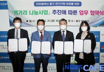 [뉴스카페]인천 중구(구청장 홍인성)는 21일 인천 중구청, 인천사회복지공동모금회, 성.미가엘종합사회복지관, 영종공감복지센터 등 4개 기관이 공동으로 '먹거리 나눔사업' 추진을 위한 업무 협약을 체결했다고 밝혔다.