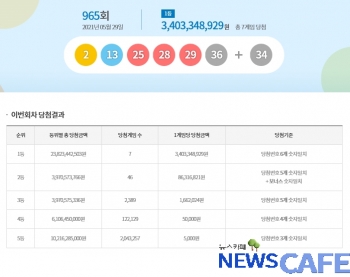 [뉴스카페]29일 추첨한 동행복권 965회 로또6/45 1등 당첨자는 7명으로 1인당 34억334만원씩의 당첨금을 받는다.