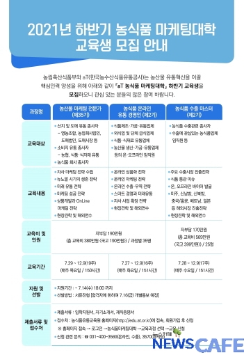 [뉴스카페]한국농수산식품유통공사(aT, 사장 김춘진) 농식품유통교육원은 농식품 산업을 선도하고 유통·수출 분야의 혁신을 이끌 핵심 인력 양성을 위하여 2021년 농식품마케팅대학 하반기 교육생을 오는 7월 14일까지 모집한다.