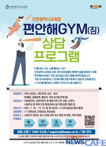 [뉴스카페]인천광역시교육청(교육감 도성훈)은 행복한 직장 생활을 지원하기 위한 전문심리상담프로그램인 ‘편안해GYM(짐)’을 19일부터 운영한다고 밝혔다.