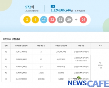 [뉴스카페]17일 추첨한 동행복권 972회 로또6/45 1등 당첨자는 20명으로 1인당 11억2,488만원씩의 당첨금을 받는다.