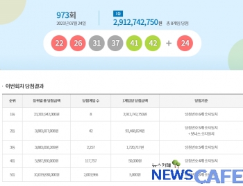 [뉴스카페]24일 추첨한 동행복권 973회 로또6/45 1등 당첨자는 8명으로 1인당 29억1,274만원씩의 당첨금을 받는다.