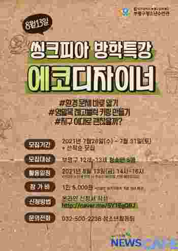 [뉴스카페]인천 부평구(구청장 차준택)청소년수련관이 오는 31일까지 창의공작플라자 씽크피아 방학특강 ‘에코디자이너’에 참가할 지역 내 12~13세 청소년을 선착순으로 모집한다.