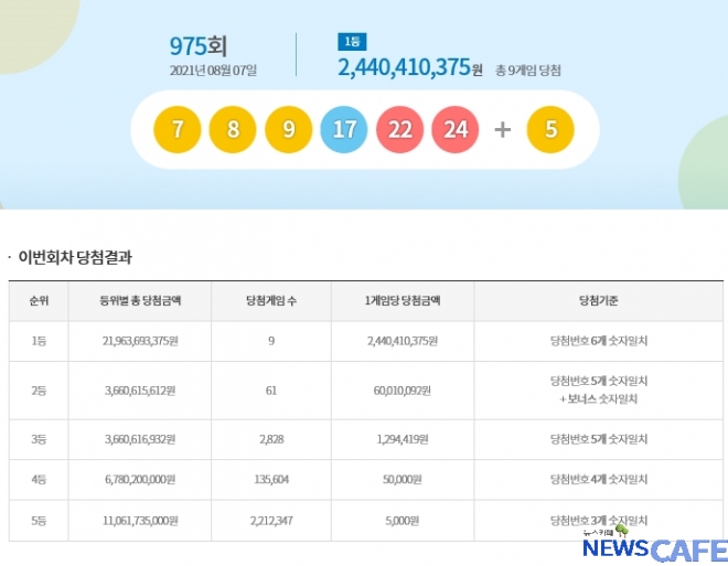 [뉴스카페]7일 추첨한 동행복권 975회 로또6/45 1등 당첨자는 9명으로 1인당 24억4,041만원씩의 당첨금을 받는다.