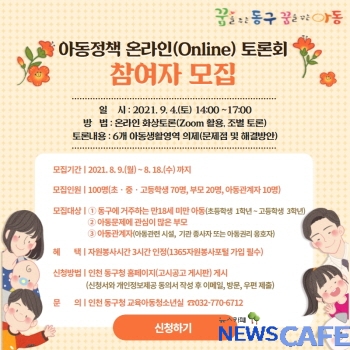 [뉴스카페]인천 동구(구청장 허인환)가 오는 9월 4일 열리는 ‘아동정책 온라인(Online) 토론회’에 참여할 구민을 모집한다.