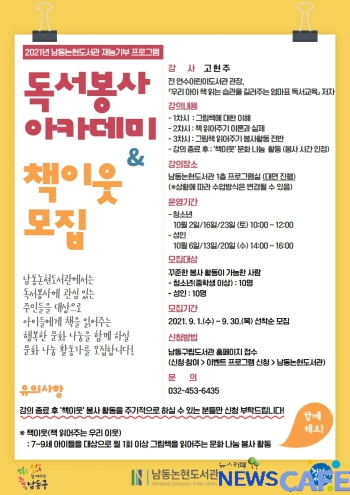 [뉴스카페]인천 남동논현도서관은 독서봉사에 관심 있는 주민들을 대상으로 ‘독서봉사 아카데미’와 ‘책 읽어주는 우리 이웃’프로그램을 운영한다고 27일 밝혔다.