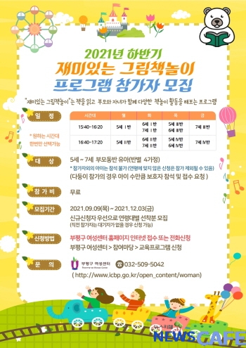 [뉴스카페]인천 부평구(구청장 차준택)여성센터가 10일부터 지역 내 5세~7세 영유아와 부모를 대상으로 비대면(줌) 책 놀이 프로그램 참여자 48가정, 96명을 연령별 선착순으로 모집한다.
