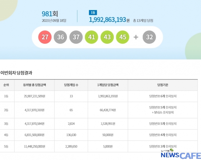 [뉴스카페]18일 추첨한 동행복권 981회 로또6/45 1등 당첨자는 13명으로 1인당 19억9,286만원씩의 당첨금을 받는다.