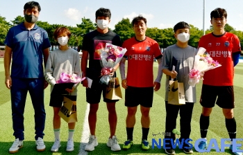 [뉴스카페]FC남동은 지난 2일 오후 남동공단근린공원 운동장에서 열린 '2021 K4리그' 26라운드 여주시민축구단과의 경기에 앞서 남동구 관내에 거주하는 축구 꿈나무 3명에게 장학금을 전달했다.