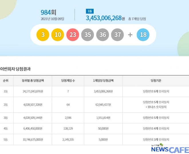[뉴스카페]9일 추첨한 동행복권 984회 로또6/45 1등 당첨자는 7명으로 1인당 34억5,300만원씩의 당첨금을 받는다.